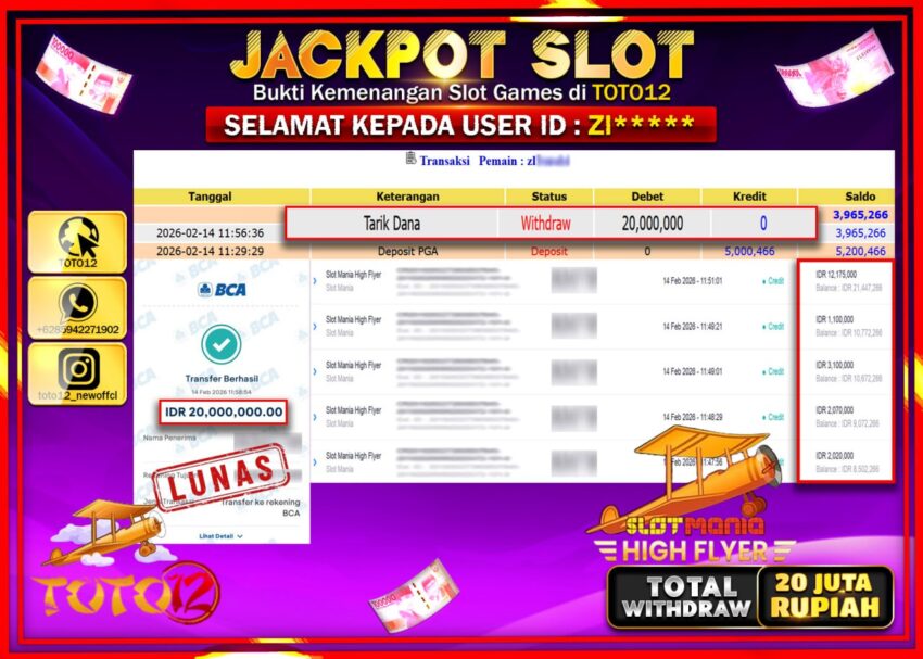 Selamat kepada Member Kami Zi****** Telah Jackpot dan berhasil mendapatkan kemenangan besar pada permainan JACKPOT SLOT GAME (SLOT MANIA HIGH FLYER) Dengan Kemenangan Sebesar Rp.20.000.000–.