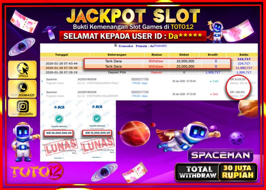 HANYA DI TOTO12 JP PASTI DI BAYAR LUNAS DAN CEPAT!!!!!! JACKPOT SLOT GAME (SPACEMAN) Rp.30.000.000 !!!!