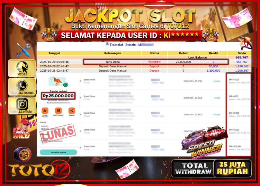 Selamat kepada Member Kami Ki****** Telah Jackpot dan berhasil mendapatkan kemenangan besar pada permainan JACKPOT SLOT GAME (SPEED WINNER) Dengan Kemenangan Sebesar Rp.25.000.000 –. Setelah mengisi Fomulir Withdraw dengan Kurang waktu 1-2 Menit Dana sudah kami Trasnfer kepada Pemilik Userid dan dana sudah dapat di cairkan oleh pemenang. Bukti Pembayaran yang TOTO12 berikan merupakan Bukti Pembayaran yang SAH / VALID yang langsung Di dapatkan melalui transaksi dari Bank yang di Tunju.