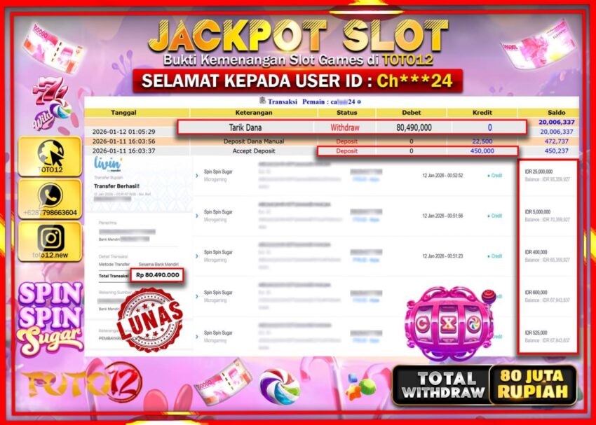 HANYA DI TOTO12 JP PASTI DI BAYAR LUNAS DAN CEPAT!!!!!! JACKPOT SLOT GAME (SPIN SPIN SUGAR) Rp.80.490.000 !!!!