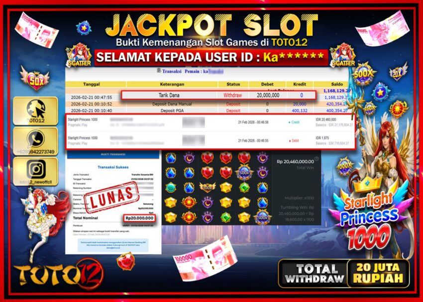 Selamat kepada Member Kami Ka***** Telah Jackpot dan berhasil mendapatkan kemenangan besar pada permainan JACKPOT SLOT GAME  (STARLIGHT PRINCES 1000)  Dengan Kemenangan Sebesar Rp.20.000.000–.