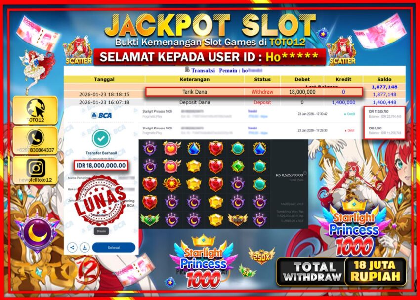 Selamat kepada Member Kami Ho****** Telah Jackpot dan berhasil mendapatkan kemenangan besar pada permainan JACKPOT SLOT GAME (STARLIGHT PRINCESS ) Dengan Kemenangan Sebesar Rp.18.000.000 –.