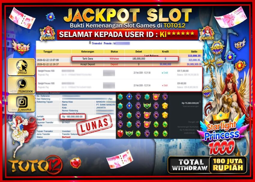 Selamat kepada Member Kami Ki***** Telah Jackpot dan berhasil mendapatkan kemenangan besar pada permainan JACKPOT SLOT GAME (STARLIGHT PRINCESS 1000) Dengan Kemenangan Sebesar Rp.180.000.000–.