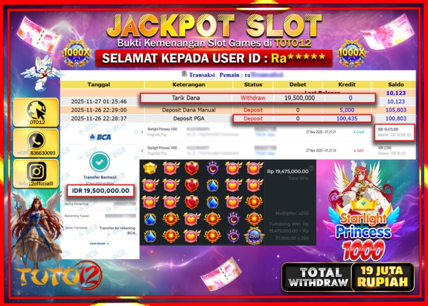 Selamat kepada Member Kami Ra****** Telah Jackpot dan berhasil mendapatkan kemenangan besar pada permainan JACKPOT SLOT GAME (STARLIGHT PRINCESS 1000) Dengan Kemenangan Sebesar Rp.19.500.000 –.