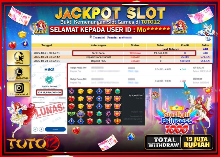 Selamat kepada Member Kami Mo****** Telah Jackpot dan berhasil mendapatkan kemenangan besar pada permainan JACKPOT SLOT GAME (STARLIGHT PRINCESS 1000) Dengan Kemenangan Sebesar Rp.19.549.000 –. Setelah mengisi Fomulir Withdraw dengan Kurang waktu 1-2 Menit Dana sudah kami Trasnfer kepada Pemilik Userid dan dana sudah dapat di cairkan oleh pemenang. Bukti Pembayaran yang TOTO12 berikan merupakan Bukti Pembayaran yang SAH / VALID yang langsung Di dapatkan melalui transaksi dari Bank yang di Tunju.