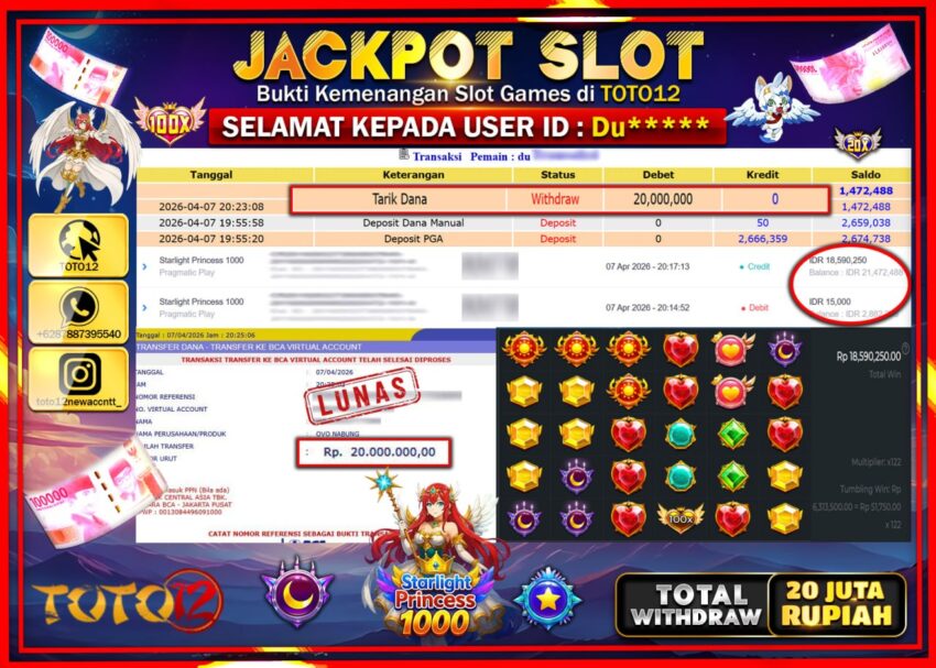 Selamat kepada Member Kami Du****** Telah Jackpot dan berhasil mendapatkan kemenangan besar pada permainan JACKPOT SLOT GAME (STARLIGHT PRINCESS 1000) Dengan Kemenangan Sebesar Rp.20.000.000–.