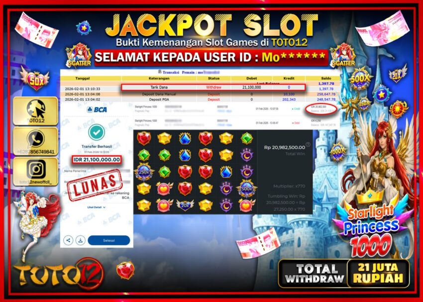 Selamat kepada Member Kami Mo****** Telah Jackpot dan berhasil mendapatkan kemenangan besar pada permainan JACKPOT SLOT GAME (STARLIGHT PRINCESS 1000) Dengan Kemenangan Sebesar Rp.21.100.000 –.
