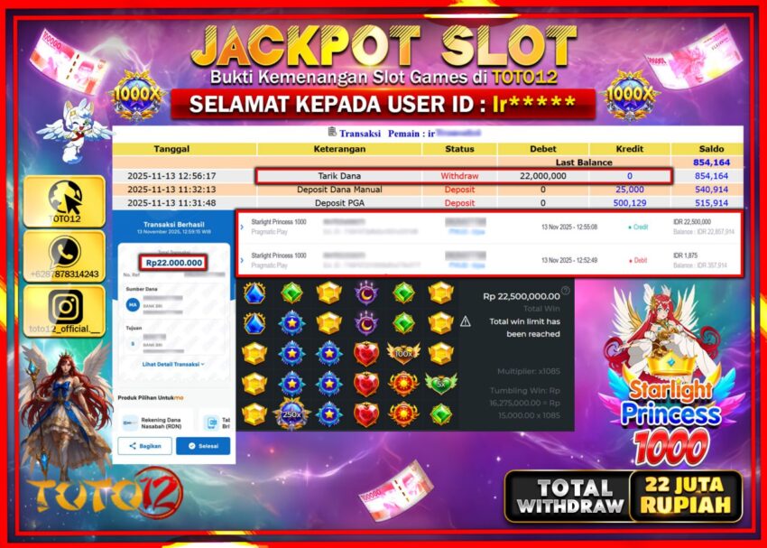 Selamat kepada Member Kami Ir****** Telah Jackpot dan berhasil mendapatkan kemenangan besar pada permainan JACKPOT SLOT GAME (STARLIGHT PRINCESS 1000) Dengan Kemenangan Sebesar Rp.22.000.000 –. Setelah mengisi Fomulir Withdraw dengan Kurang waktu 1-2 Menit Dana sudah kami Trasnfer kepada Pemilik Userid dan dana sudah dapat di cairkan oleh pemenang. Bukti Pembayaran yang TOTO12 berikan merupakan Bukti Pembayaran yang SAH / VALID yang langsung Di dapatkan melalui transaksi dari Bank yang di Tunju.