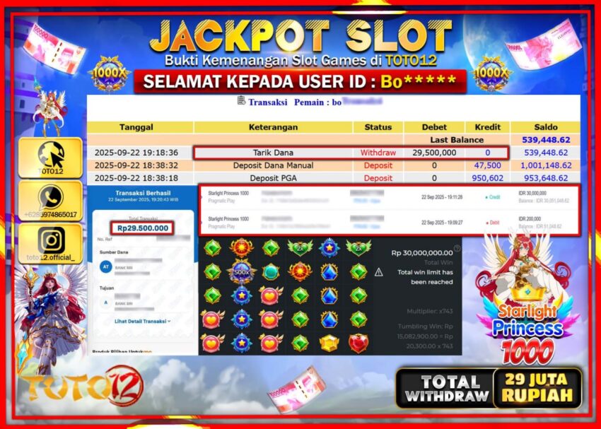 Selamat kepada Member Kami Bo***** Telah Jackpot dan berhasil mendapatkan kemenangan besar pada permainan JACKPOT SLOT GAME (STARLIGHT PRINCESS 1000) Dengan Kemenangan Sebesar Rp.29.500.000 –. Setelah mengisi Fomulir Withdraw dengan Kurang waktu 1-2 Menit Dana sudah kami Trasnfer kepada Pemilik Userid dan dana sudah dapat di cairkan oleh pemenang. Bukti Pembayaran yang TOTO12 berikan merupakan Bukti Pembayaran yang SAH / VALID yang langsung Di dapatkan melalui transaksi dari Bank yang di Tunju.