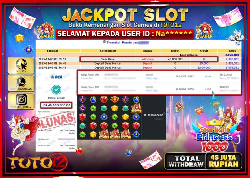Selamat kepada Member Kami Na****** Telah Jackpot dan berhasil mendapatkan kemenangan besar pada permainan JACKPOT SLOT GAME (STARLIGHT PRINCESS 1000)  Dengan Kemenangan Sebesar Rp.45.000.000 –.  Setelah mengisi Fomulir Withdraw dengan Kurang waktu 1-2 Menit Dana sudah kami Trasnfer kepada Pemilik Userid dan dana sudah dapat di cairkan oleh pemenang. Bukti Pembayaran yang TOTO12 berikan merupakan Bukti Pembayaran yang  SAH / VALID yang langsung Di dapatkan melalui transaksi dari Bank yang di Tunju.
