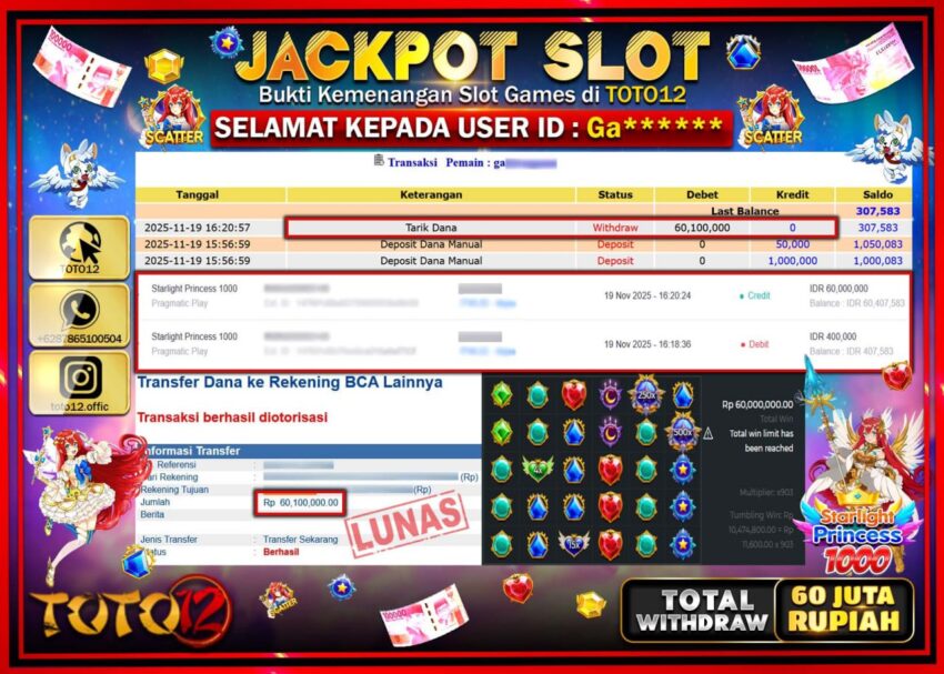 Selamat kepada Member Kami Ga****** Telah Jackpot dan berhasil mendapatkan kemenangan besar pada permainan JACKPOT SLOT GAME (STARLIGHT PRINCESS 1000) Dengan Kemenangan Sebesar Rp.60.100.000 –. Setelah mengisi Fomulir Withdraw dengan Kurang waktu 1-2 Menit Dana sudah kami Trasnfer kepada Pemilik Userid dan dana sudah dapat di cairkan oleh pemenang. Bukti Pembayaran yang TOTO12 berikan merupakan Bukti Pembayaran yang SAH / VALID yang langsung Di dapatkan melalui transaksi dari Bank yang di Tunju.