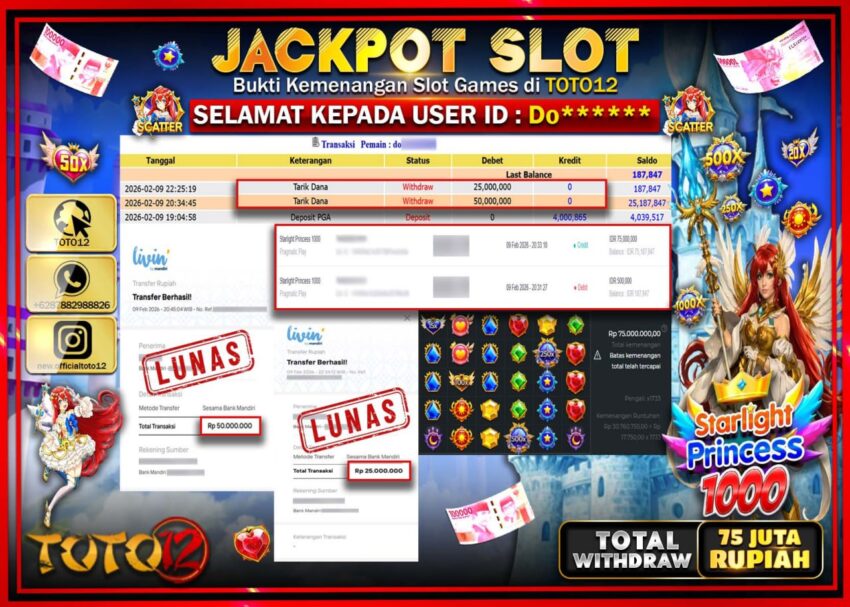 Selamat kepada Member Kami Do***** Telah Jackpot dan berhasil mendapatkan kemenangan besar pada permainan JACKPOT SLOT GAME  (STARLIGHT PRINCESS 1000)  Dengan Kemenangan Sebesar Rp.75.000.000–.