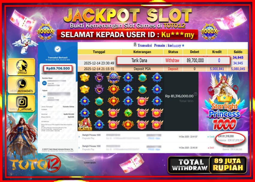 Selamat kepada Member Kami Ku****** Telah Jackpot dan berhasil mendapatkan kemenangan besar pada permainan JACKPOT SLOT GAME (STARLIGHT PRINCESS 1000)  Dengan Kemenangan Sebesar Rp.89.700.000 –.