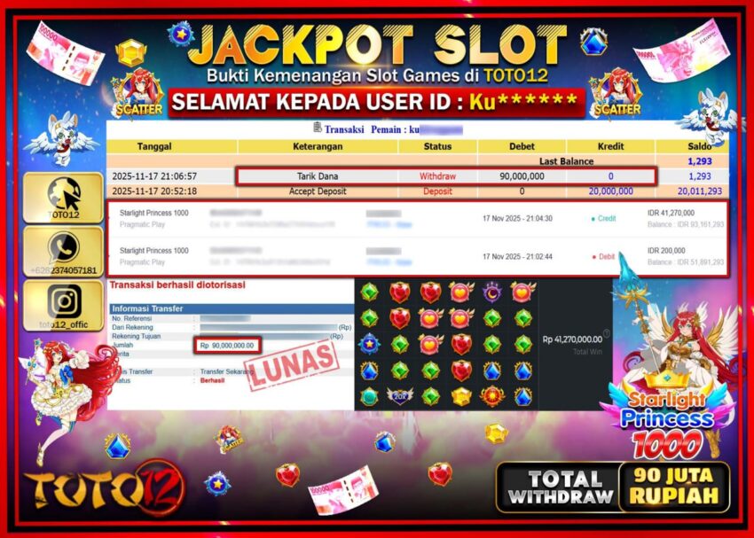 Selamat kepada Member Kami Ku****** Telah Jackpot dan berhasil mendapatkan kemenangan besar pada permainan JACKPOT SLOT GAME (STARLIGHT PRINCESS 1000) Dengan Kemenangan Sebesar Rp.90.000.000 –. Setelah mengisi Fomulir Withdraw dengan Kurang waktu 1-2 Menit Dana sudah kami Trasnfer kepada Pemilik Userid dan dana sudah dapat di cairkan oleh pemenang. Bukti Pembayaran yang TOTO12 berikan merupakan Bukti Pembayaran yang SAH / VALID yang langsung Di dapatkan melalui transaksi dari Bank yang di Tunju.