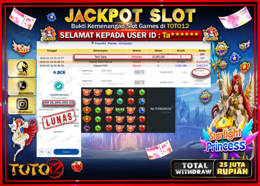 Selamat kepada Member Kami Ta*****  Telah Jackpot dan berhasil mendapatkan kemenangan besar pada permainan JACKPOT SLOT GAME  (STARLIGHT PRINCESS)  Dengan Kemenangan Sebesar Rp.25.000.000–.