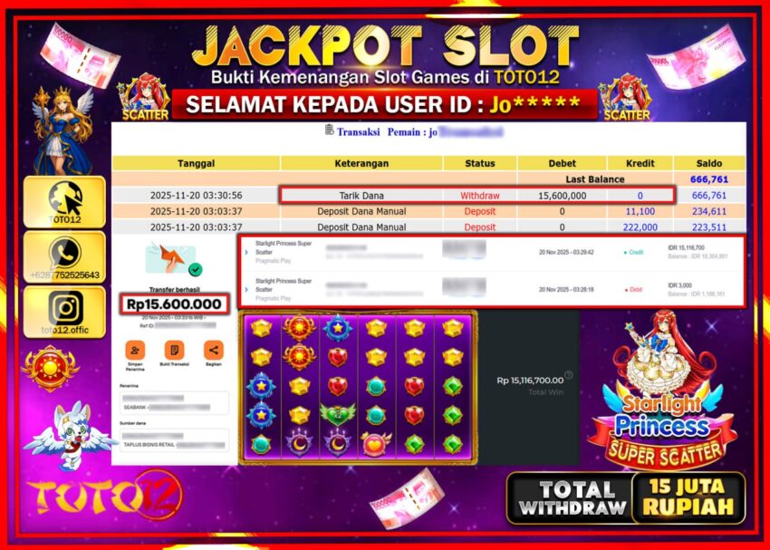 Selamat kepada Member Kami Jo****** Telah Jackpot dan berhasil mendapatkan kemenangan besar pada permainan JACKPOT SLOT GAME (STARLIGHT PRINCESS SUPER SCATTER) Dengan Kemenangan Sebesar Rp.15.600.000 –. Setelah mengisi Fomulir Withdraw dengan Kurang waktu 1-2 Menit Dana sudah kami Trasnfer kepada Pemilik Userid dan dana sudah dapat di cairkan oleh pemenang. Bukti Pembayaran yang TOTO12 berikan merupakan Bukti Pembayaran yang SAH / VALID yang langsung Di dapatkan melalui transaksi dari Bank yang di Tunju.