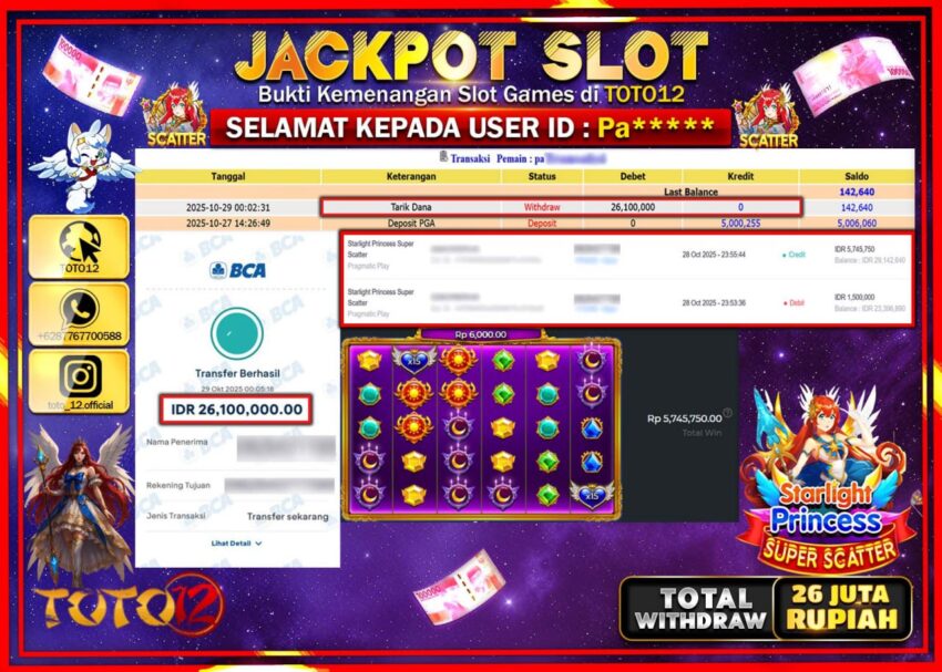 Selamat kepada Member Kami Pa****** Telah Jackpot dan berhasil mendapatkan kemenangan besar pada permainan JACKPOT SLOT GAME (STARLIGHT PRINCESS SUPER SCATTER) Dengan Kemenangan Sebesar Rp.26.100.000 –. Setelah mengisi Fomulir Withdraw dengan Kurang waktu 1-2 Menit Dana sudah kami Trasnfer kepada Pemilik Userid dan dana sudah dapat di cairkan oleh pemenang. Bukti Pembayaran yang TOTO12 berikan merupakan Bukti Pembayaran yang SAH / VALID yang langsung Di dapatkan melalui transaksi dari Bank yang di Tunju.