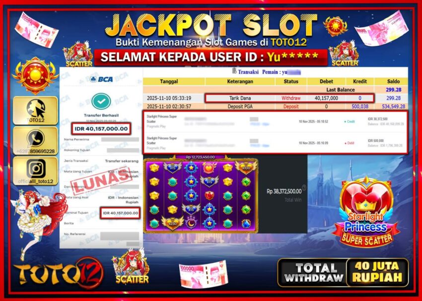 Selamat kepada Member Kami Yu****** Telah Jackpot dan berhasil mendapatkan kemenangan besar pada permainan JACKPOT SLOT GAME (STARLIGHT PRINCESS SUPER SCATTER)  Dengan Kemenangan Sebesar Rp.40.157.000 –.  Setelah mengisi Fomulir Withdraw dengan Kurang waktu 1-2 Menit Dana sudah kami Trasnfer kepada Pemilik Userid dan dana sudah dapat di cairkan oleh pemenang. Bukti Pembayaran yang TOTO12 berikan merupakan Bukti Pembayaran yang  SAH / VALID yang langsung Di dapatkan melalui transaksi dari Bank yang di Tunju.