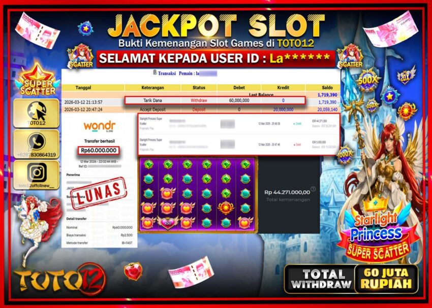 HANYA DI TOTO12 JP PASTI DI BAYAR LUNAS DAN CEPAT!!!!!! JACKPOT SLOT GAME (STARLIGHT PRINCESS SUPER SCATTER) Rp.60.000.000!!!!