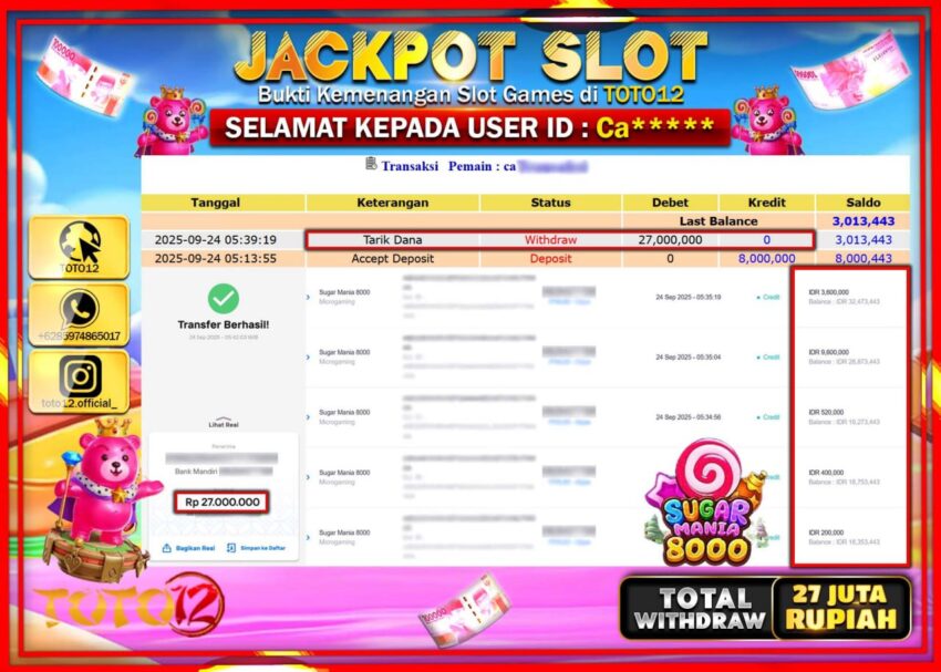 Selamat kepada Member Kami Ca****** Telah Jackpot dan berhasil mendapatkan kemenangan besar pada permainan JACKPOT SLOT GAME (SUGAR MANIA 8000) Dengan Kemenangan Sebesar Rp.27.000.000 –. Setelah mengisi Fomulir Withdraw dengan Kurang waktu 1-2 Menit Dana sudah kami Trasnfer kepada Pemilik Userid dan dana sudah dapat di cairkan oleh pemenang. Bukti Pembayaran yang TOTO12 berikan merupakan Bukti Pembayaran yang SAH / VALID yang langsung Di dapatkan melalui transaksi dari Bank yang di Tunju.