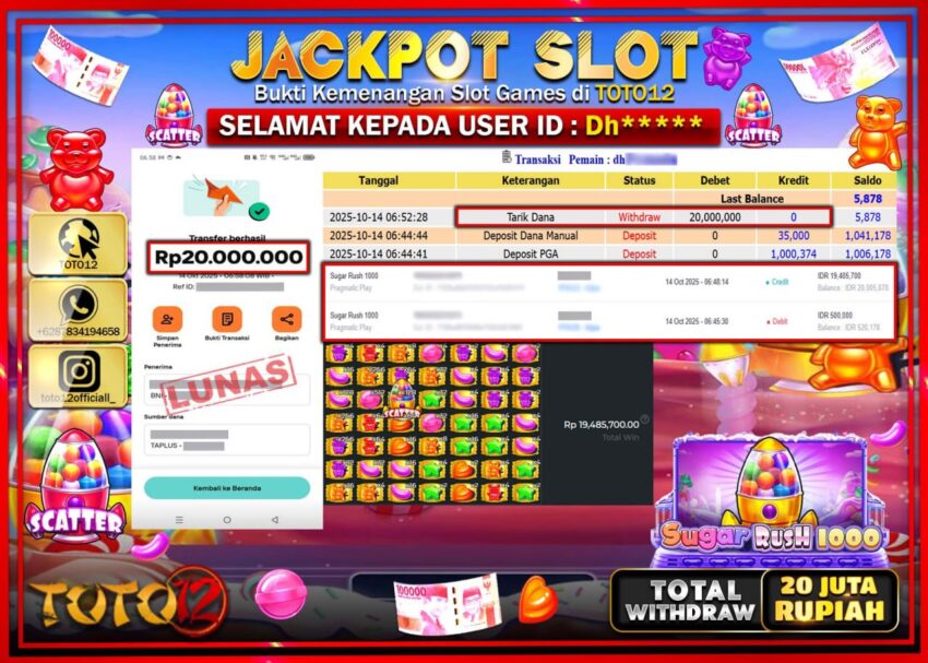Selamat kepada Member Kami Dh****** Telah Jackpot dan berhasil mendapatkan kemenangan besar pada permainan JACKPOT SLOT GAME (SUGAR RUSH 1000)  Dengan Kemenangan Sebesar Rp.20.000.000 –.  Setelah mengisi Fomulir Withdraw dengan Kurang waktu 1-2 Menit Dana sudah kami Trasnfer kepada Pemilik Userid dan dana sudah dapat di cairkan oleh pemenang. Bukti Pembayaran yang TOTO12 berikan merupakan Bukti Pembayaran yang  SAH / VALID yang langsung Di dapatkan melalui transaksi dari Bank yang di Tunju.
