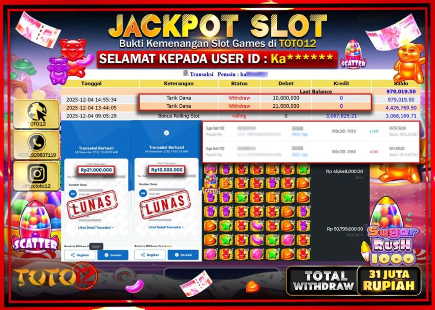HANYA DI TOTO12 JP PASTI DI BAYAR LUNAS DAN CEPAT!!!!!! JACKPOT SLOT GAME (SUGAR RUSH 1000) Rp.31.000.000 !!!!