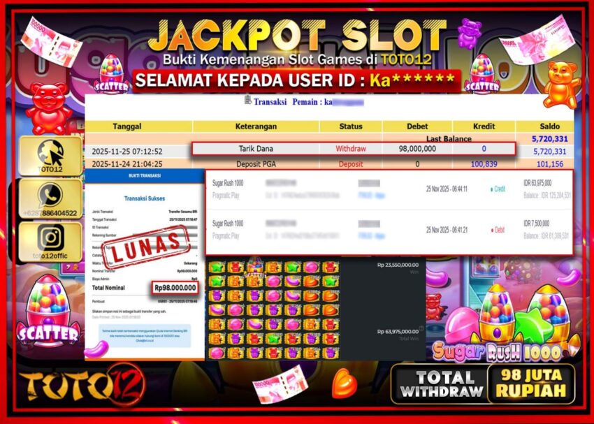 HANYA DI TOTO12 JP PASTI DI BAYAR LUNAS DAN CEPAT!!!!!! JACKPOT SLOT GAME (SUGAR RUSH 1000) Rp.98.000.000 !!!!