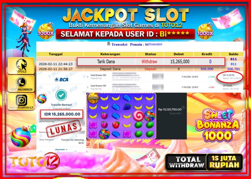 Selamat kepada Member Kami Bi****** Telah Jackpot dan berhasil mendapatkan kemenangan besar pada permainan JACKPOT SLOT GAME (SWEET BONANZA 1000) Dengan Kemenangan Sebesar Rp.15.265.000–.