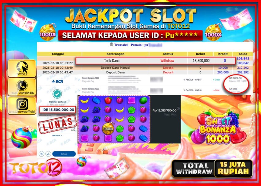 Selamat kepada Member Kami Pu******* Telah Jackpot dan berhasil mendapatkan kemenangan besar pada permainan JACKPOT SLOT GAME (SWEET BONANZA 1000) Dengan Kemenangan Sebesar Rp.15.500.000–.