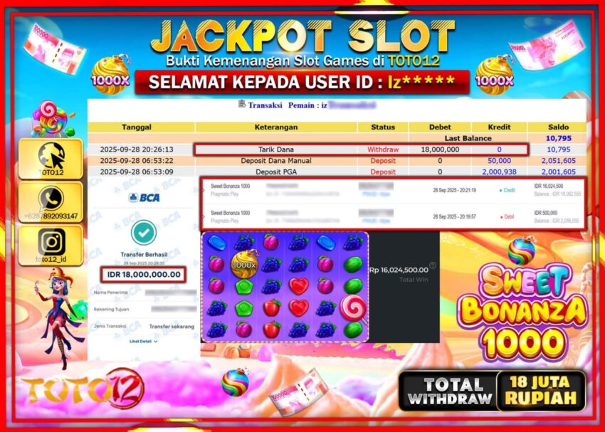 Selamat kepada Member Kami Iz****** Telah Jackpot dan berhasil mendapatkan kemenangan besar pada permainan JACKPOT SLOT GAME (SWEET BONANZA 1000)  Dengan Kemenangan Sebesar Rp.18.000.000 –.  Setelah mengisi Fomulir Withdraw dengan Kurang waktu 1-2 Menit Dana sudah kami Trasnfer kepada Pemilik Userid dan dana sudah dapat di cairkan oleh pemenang. Bukti Pembayaran yang TOTO12 berikan merupakan Bukti Pembayaran yang  SAH / VALID yang langsung Di dapatkan melalui transaksi dari Bank yang di Tunju.