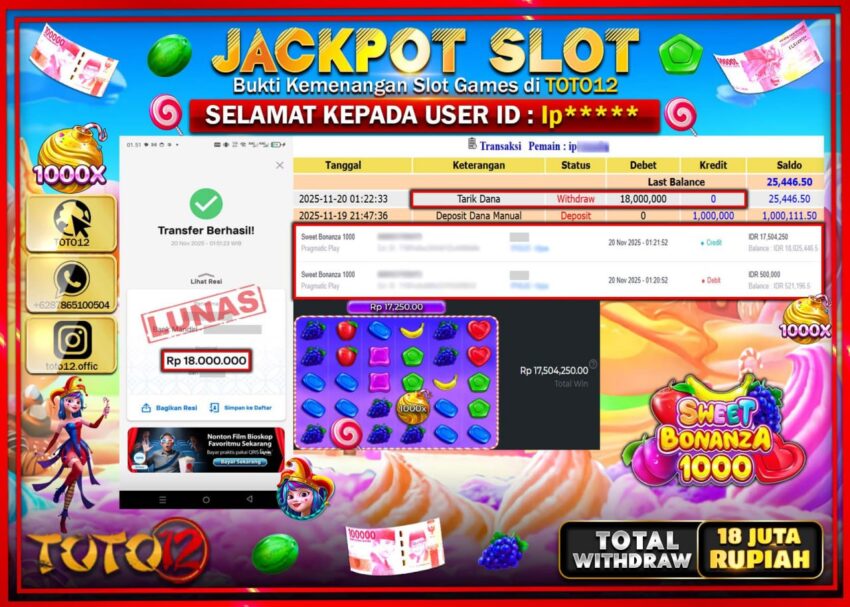 Selamat kepada Member Kami Ip****** Telah Jackpot dan berhasil mendapatkan kemenangan besar pada permainan JACKPOT SLOT GAME (SWEET BONANZA 1000) Dengan Kemenangan Sebesar Rp.18.000.000 –. Setelah mengisi Fomulir Withdraw dengan Kurang waktu 1-2 Menit Dana sudah kami Trasnfer kepada Pemilik Userid dan dana sudah dapat di cairkan oleh pemenang. Bukti Pembayaran yang TOTO12 berikan merupakan Bukti Pembayaran yang SAH / VALID yang langsung Di dapatkan melalui transaksi dari Bank yang di Tunju.
