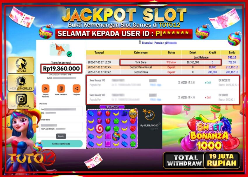 Selamat kepada Member Kami Pi****** Telah Jackpot dan berhasil mendapatkan kemenangan besar pada permainan JACKPOT SLOT GAME (SWEET BONANZA 1000) Dengan Kemenangan Sebesar Rp.19.000.000 –. Setelah mengisi Fomulir Withdraw dengan Kurang waktu 1-2 Menit Dana sudah kami Trasnfer kepada Pemilik Userid dan dana sudah dapat di cairkan oleh pemenang. Bukti Pembayaran yang TOTO12 berikan merupakan Bukti Pembayaran yang SAH / VALID yang langsung Di dapatkan melalui transaksi dari Bank yang di Tunju.