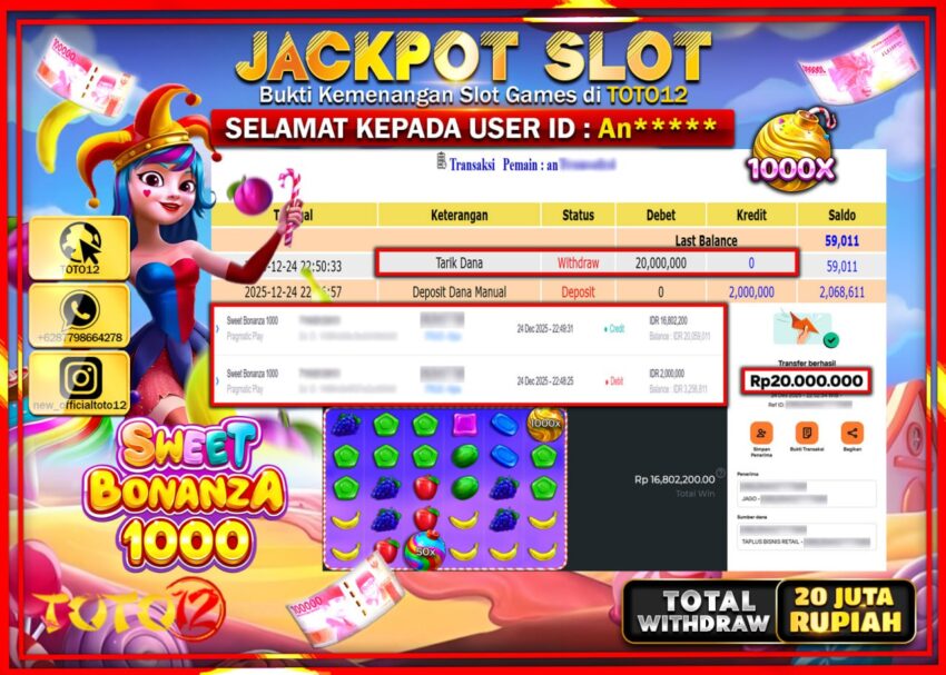Selamat kepada Member Kami An****** Telah Jackpot dan berhasil mendapatkan kemenangan besar pada permainan JACKPOT SLOT GAME (SWEET BONANZA 1000) Dengan Kemenangan Sebesar Rp.20.000.000 –.
