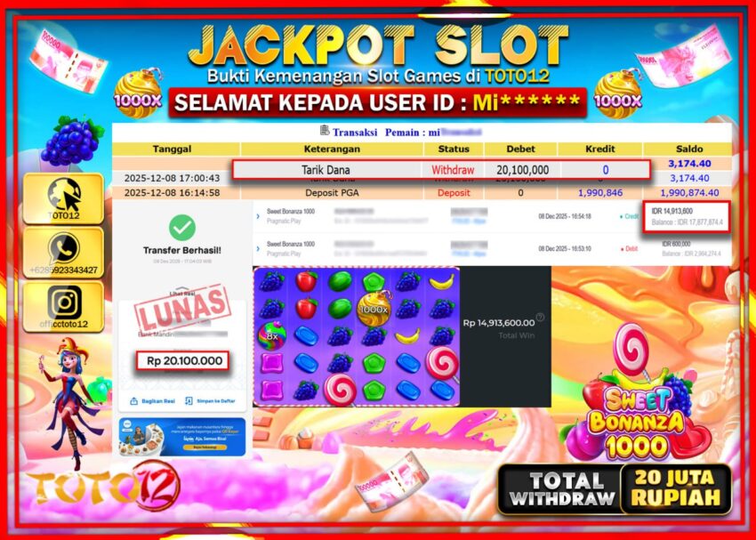 Selamat kepada Member Kami Mi****** Telah Jackpot dan berhasil mendapatkan kemenangan besar pada permainan JACKPOT SLOT GAME (SWEET BONANZA 1000) Dengan Kemenangan Sebesar Rp.20.100.000 –.