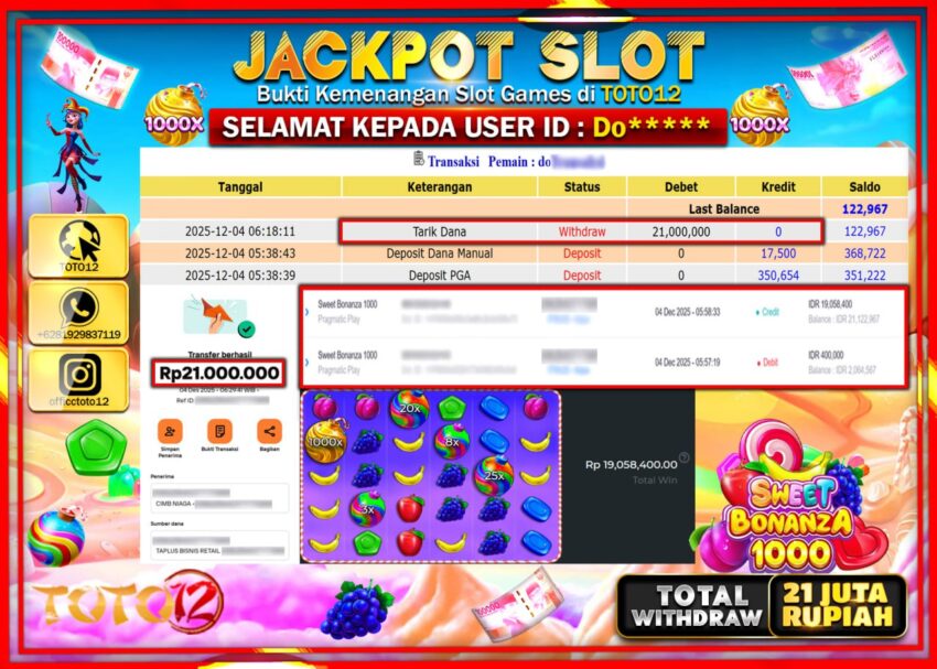 Selamat kepada Member Kami Do****** Telah Jackpot dan berhasil mendapatkan kemenangan besar pada permainan JACKPOT SLOT GAME (SWEET BONANZA 1000) Dengan Kemenangan Sebesar Rp.21.000.000 –.