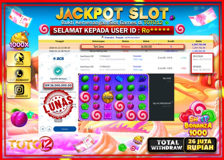 Selamat kepada Member Kami Ro****** Telah Jackpot dan berhasil mendapatkan kemenangan besar pada permainan JACKPOT SLOT GAME (SWEET BONANZA 1000) Dengan Kemenangan Sebesar Rp.26.000.000 –.