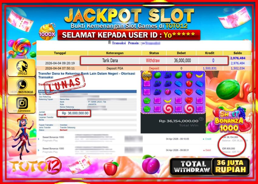Selamat kepada Member Kami Yo***** Telah Jackpot dan berhasil mendapatkan kemenangan besar pada permainan JACKPOT SLOT GAME  (SWEET BONANZA 1000)  Dengan Kemenangan Sebesar Rp.36.000.000–.