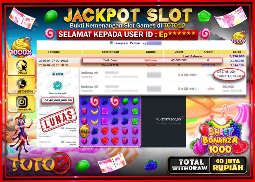 HANYA DI TOTO12 JP PASTI DI BAYAR LUNAS DAN CEPAT!!!!!! JACKPOT SLOT GAME (SWEET BONANZA 1000) Rp.40.000.000!!!!