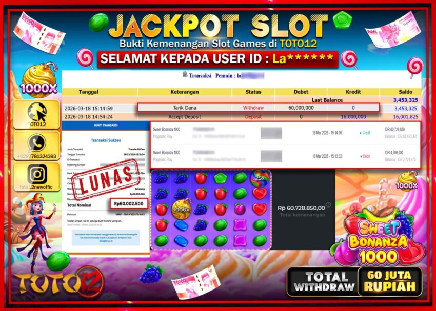 Selamat kepada Member Kami La****** Telah Jackpot dan berhasil mendapatkan kemenangan besar pada permainan JACKPOT SLOT GAME (SWEET BONANZA 1000) Dengan Kemenangan Sebesar Rp.60.000.000.