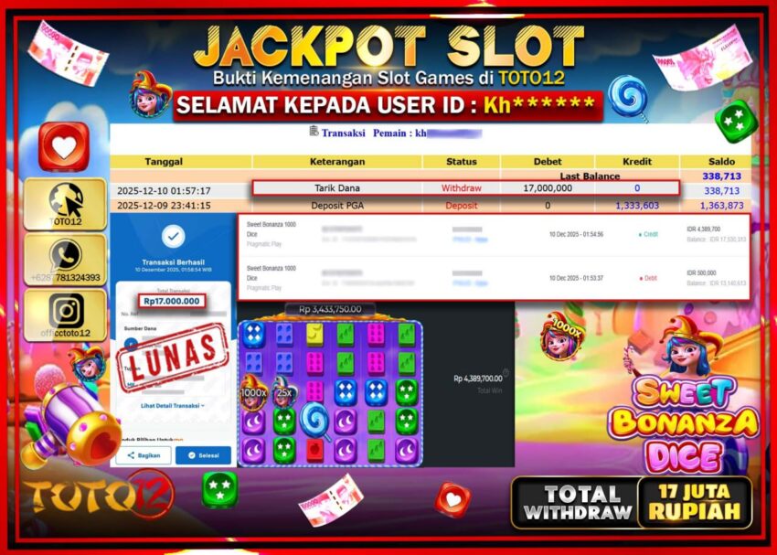 HANYA DI TOTO12 JP PASTI DI BAYAR LUNAS DAN CEPAT!!!!!! JACKPOT SLOT GAME (SWEET BONANZA DICE) Rp.17.000.000 !!!!