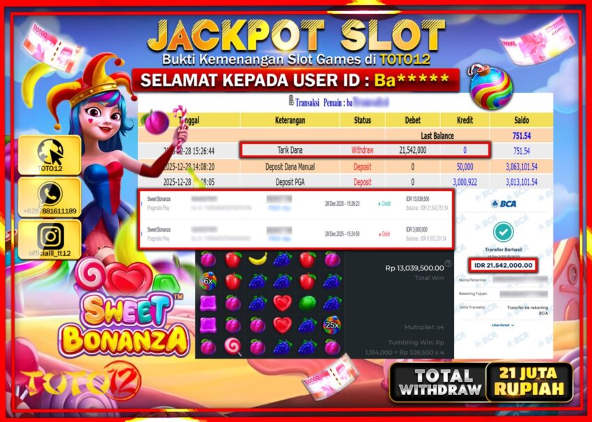 HANYA DI TOTO12 JP PASTI DI BAYAR LUNAS DAN CEPAT!!!!!! JACKPOT SLOT GAME (SWEET BONANZA) Rp.21.542.000 !!!!