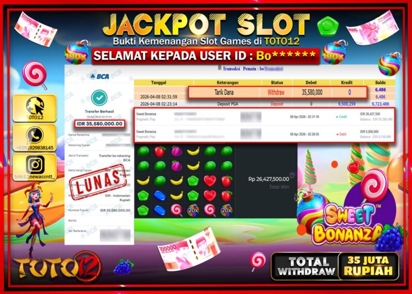 HANYA DI TOTO12 JP PASTI DI BAYAR LUNAS DAN CEPAT!!!!!! JACKPOT SLOT GAME (SWEET BONANZA) Rp.35.580.000!!!!