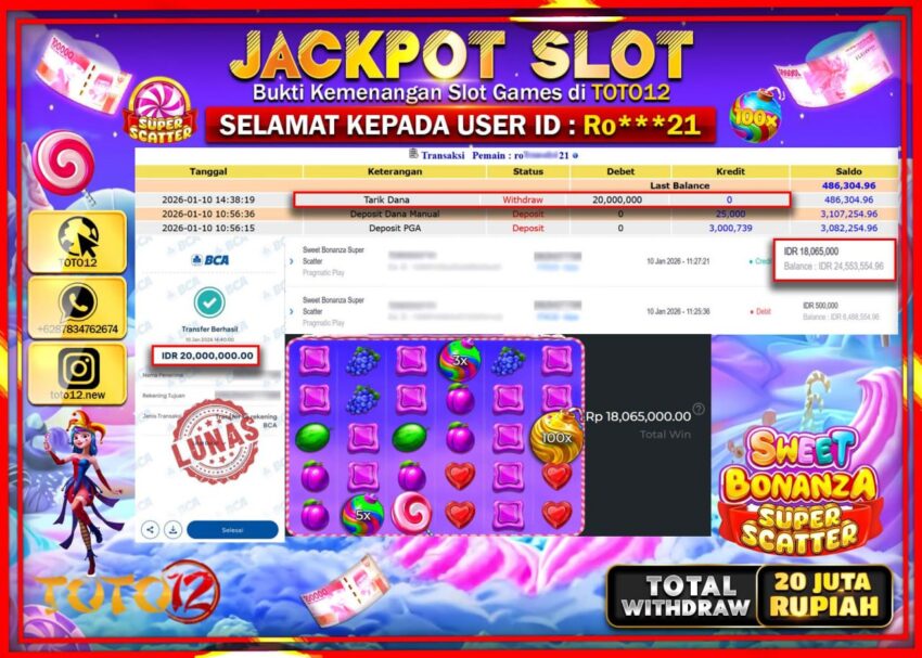 HANYA DI TOTO12 JP PASTI DI BAYAR LUNAS DAN CEPAT!!!!!! JACKPOT SLOT GAME (SWEET BONANZA SUPER SCATTER) Rp.20.000.000 !!!!