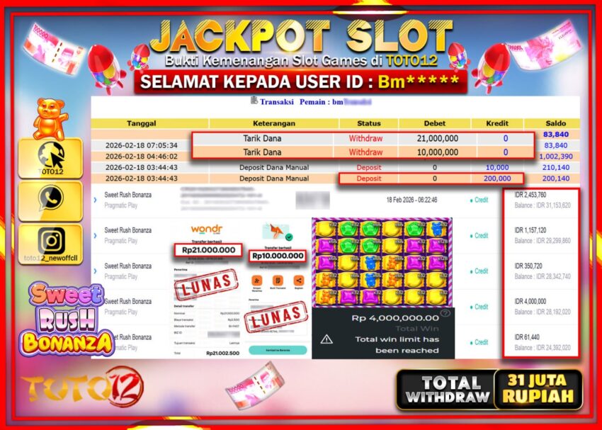 Selamat kepada Member Kami Bm****** Telah Jackpot dan berhasil mendapatkan kemenangan besar pada permainan JACKPOT SLOT GAME  (SWEET RUSH BONANZA)  Dengan Kemenangan Sebesar Rp.31.000.000–.