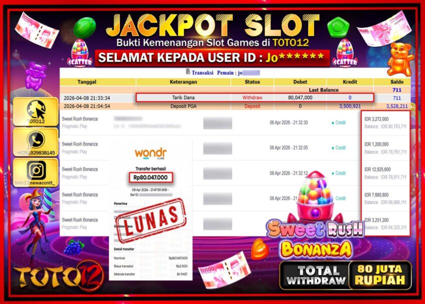 Selamat kepada Member Kami Jo***** Telah Jackpot dan berhasil mendapatkan kemenangan besar pada permainan JACKPOT SLOT GAME (SWEET RUSH BONANZA) Dengan Kemenangan Sebesar Rp.80.047.000–.