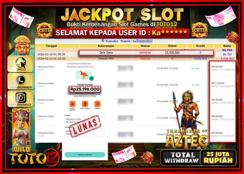 Selamat kepada Member Kami Ka*****  Telah Jackpot dan berhasil mendapatkan kemenangan besar pada permainan JACKPOT SLOT GAME  (TREASURES OF AZTEC)  Dengan Kemenangan Sebesar Rp.25.000.000–.