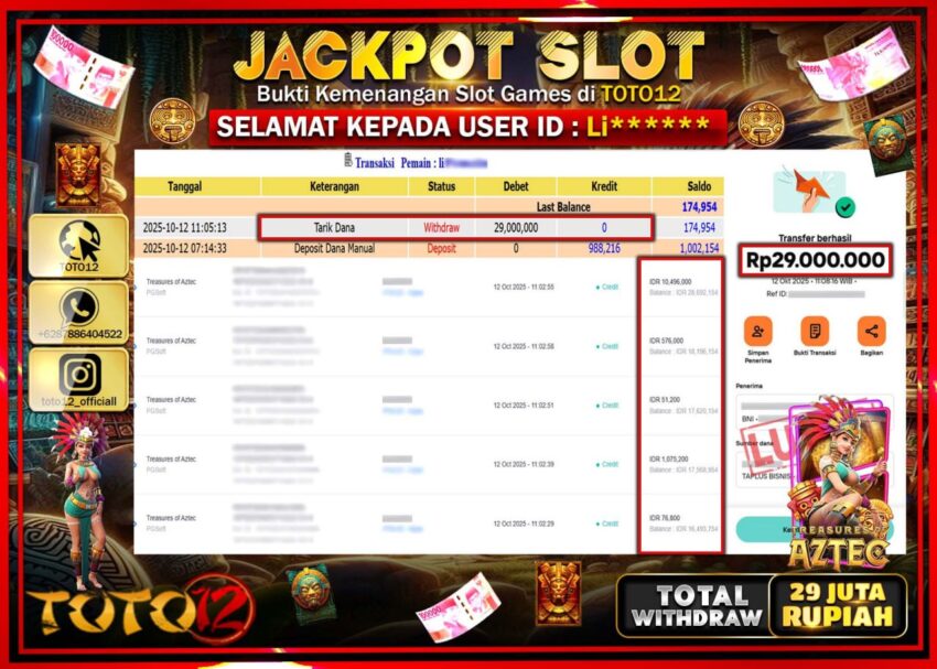 Selamat kepada Member Kami Li****** Telah Jackpot dan berhasil mendapatkan kemenangan besar pada permainan JACKPOT SLOT GAME (TREASURES OF AZTEC) Dengan Kemenangan Sebesar Rp.29.000.000 –. Setelah mengisi Fomulir Withdraw dengan Kurang waktu 1-2 Menit Dana sudah kami Trasnfer kepada Pemilik Userid dan dana sudah dapat di cairkan oleh pemenang. Bukti Pembayaran yang TOTO12 berikan merupakan Bukti Pembayaran yang SAH / VALID yang langsung Di dapatkan melalui transaksi dari Bank yang di Tunju.
