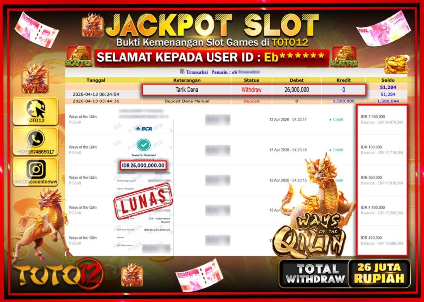 Selamat kepada Member Kami Eb***** Telah Jackpot dan berhasil mendapatkan kemenangan besar pada permainan JACKPOT SLOT GAME (WAYS OF THE QILIH) Dengan Kemenangan Sebesar Rp.26.000.000–.
