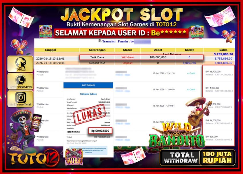 Selamat kepada Member Kami Be****** Telah Jackpot dan berhasil mendapatkan kemenangan besar pada permainan JACKPOT SLOT GAME (WILD BANDITO) Dengan Kemenangan Sebesar Rp.100.000.000 –.