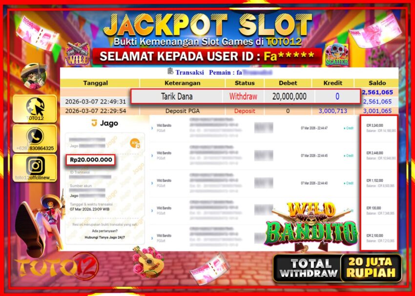Selamat kepada Member Kami Fa**** Telah Jackpot dan berhasil mendapatkan kemenangan besar pada permainan JACKPOT SLOT GAME (WILD BANDITO) Dengan Kemenangan Sebesar Rp.20.000.000–.